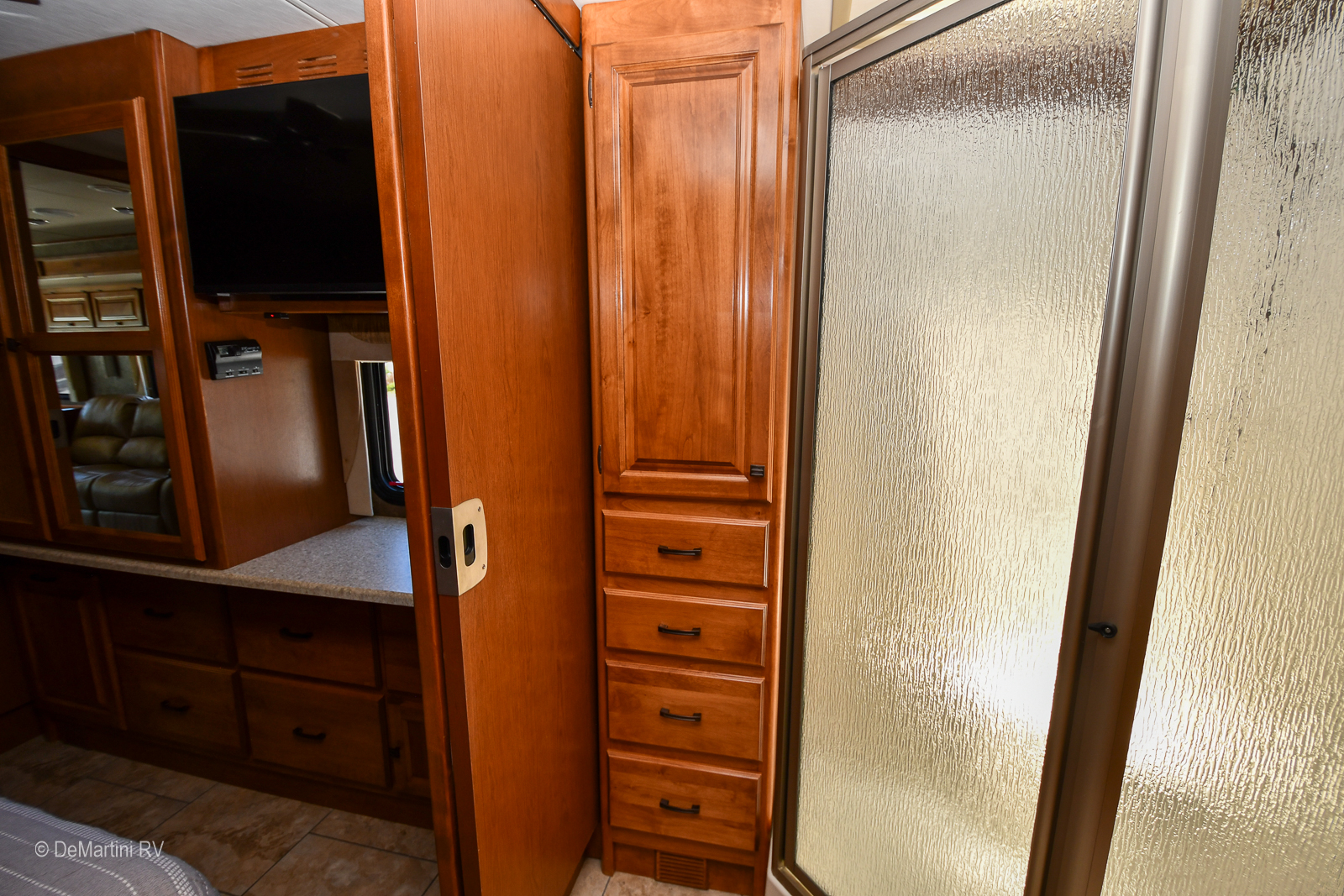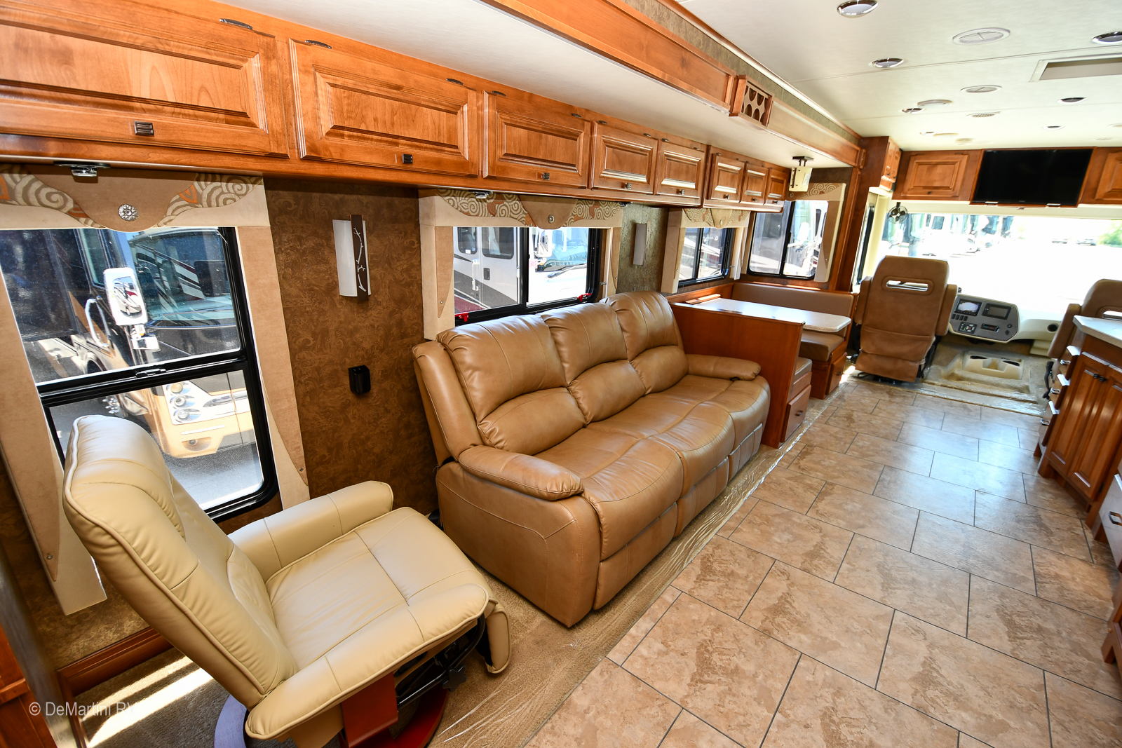 Equipment Includes: Aluminum Wheels • Side-Hinged Baggage Doors • Pass Through Storage • Hydraulic Leveling Jacks • 3M Film Front Mask • Solar Panels • Exterior Entertainment Center with TV • Auto Patio Awning • Dual Ducted Roof A/Cs • 3-Camera Rear Vision System • Drivers Door • Power Leather Cockpit Seats • Co-Pilot Power Footrest • GPS Navigation System • Trip Computer • Power Sun Visors • Central Vacuum System • Water Purifier • Combination Washer/Dryer • Blu-Ray Player • LCD TV in Bedroom • LCD TV in Cockpit • Residential Refrigerator • Fireplace • Convection Microwave • Ceiling Fan in Bedroom • Solid Surface Countertop. Equipped with an Onan 7.0KW Gas Generator with 274 Hours.