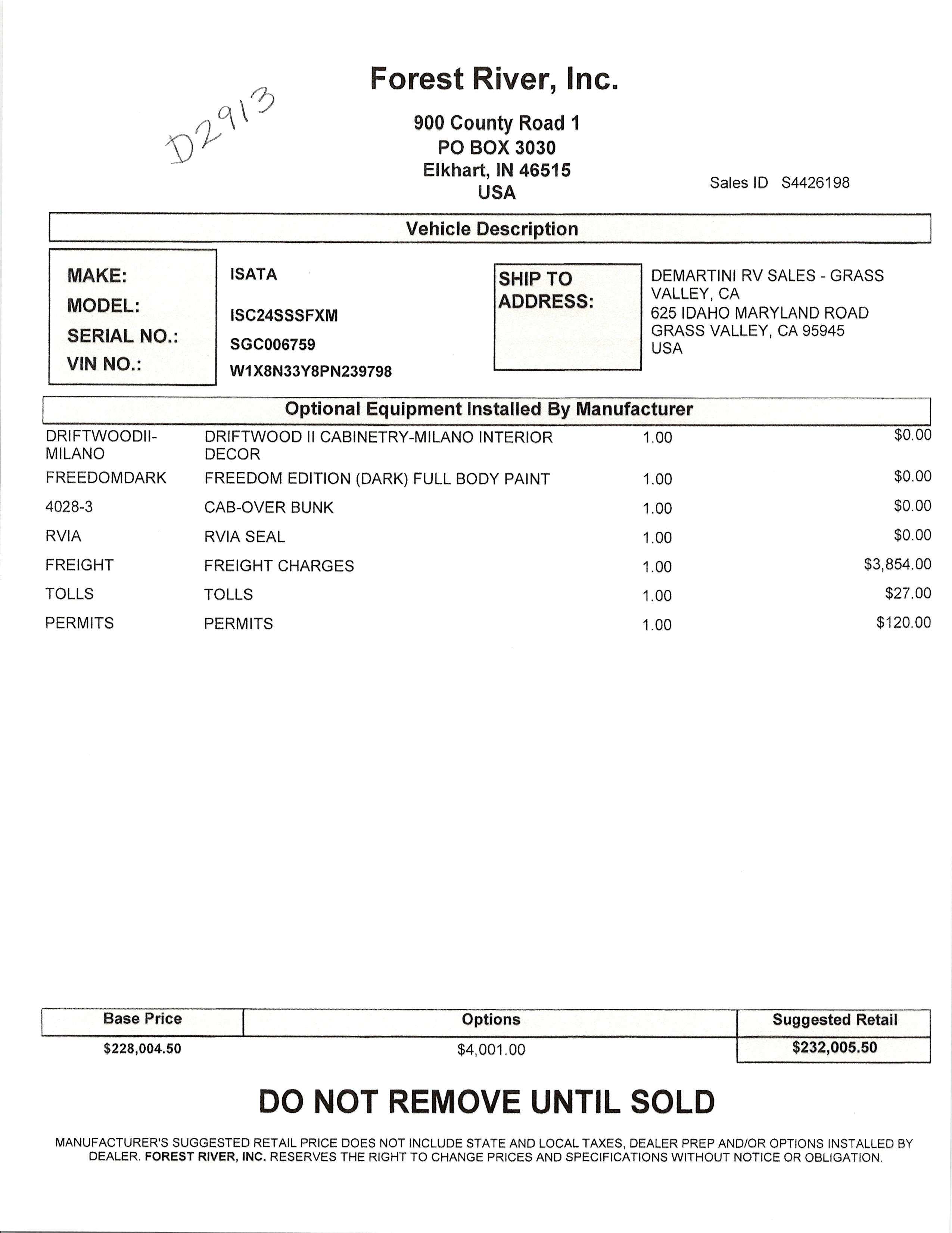 The MSRP is over $232K but our price is slashed too low to advertise! Contact us for our LOWEST Price! Item #D2913 DeMartini RV Sales