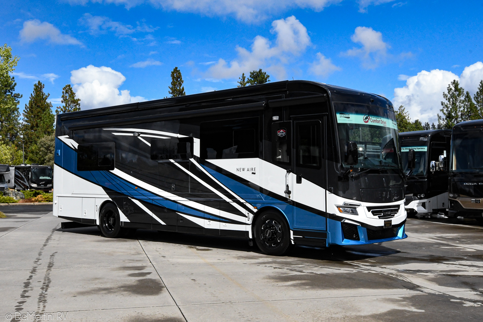 2026 Newmar New Aire 3543 Full Wall/3 Slide-Out Luxury Class A Diesel Motorhome. The 2026 New Aire offers a perfect blend of sophisticated design and advanced technology, providing a luxurious travel experience in a more compact size. The 2026 New Aire redefines compact luxury travel with its exquisite design and state-of-the-art features. Perfect for discerning travelers who value both elegance and practicality. The New Aire is Newmar's most accessible entry into Class A luxury travel. At just 35 feet long, this compact diesel pusher offers responsive 450 horsepower performance with Comfort Drive™ adaptive steering, delivering quiet confidence on the road and full comfort at every destination—even places larger coaches simply can't access. Experience premium living with high-end finishes including standard Italian leather upholstery and heated tile floors. Travel in premium comfort with heated six-way power-adjustable driver and passenger seats. The MSRP is over $707K but OUR PRICE is slashed too low to advertise! Contact us for our LOWEST PRICE! Item #D3140 DeMartini RV Sales