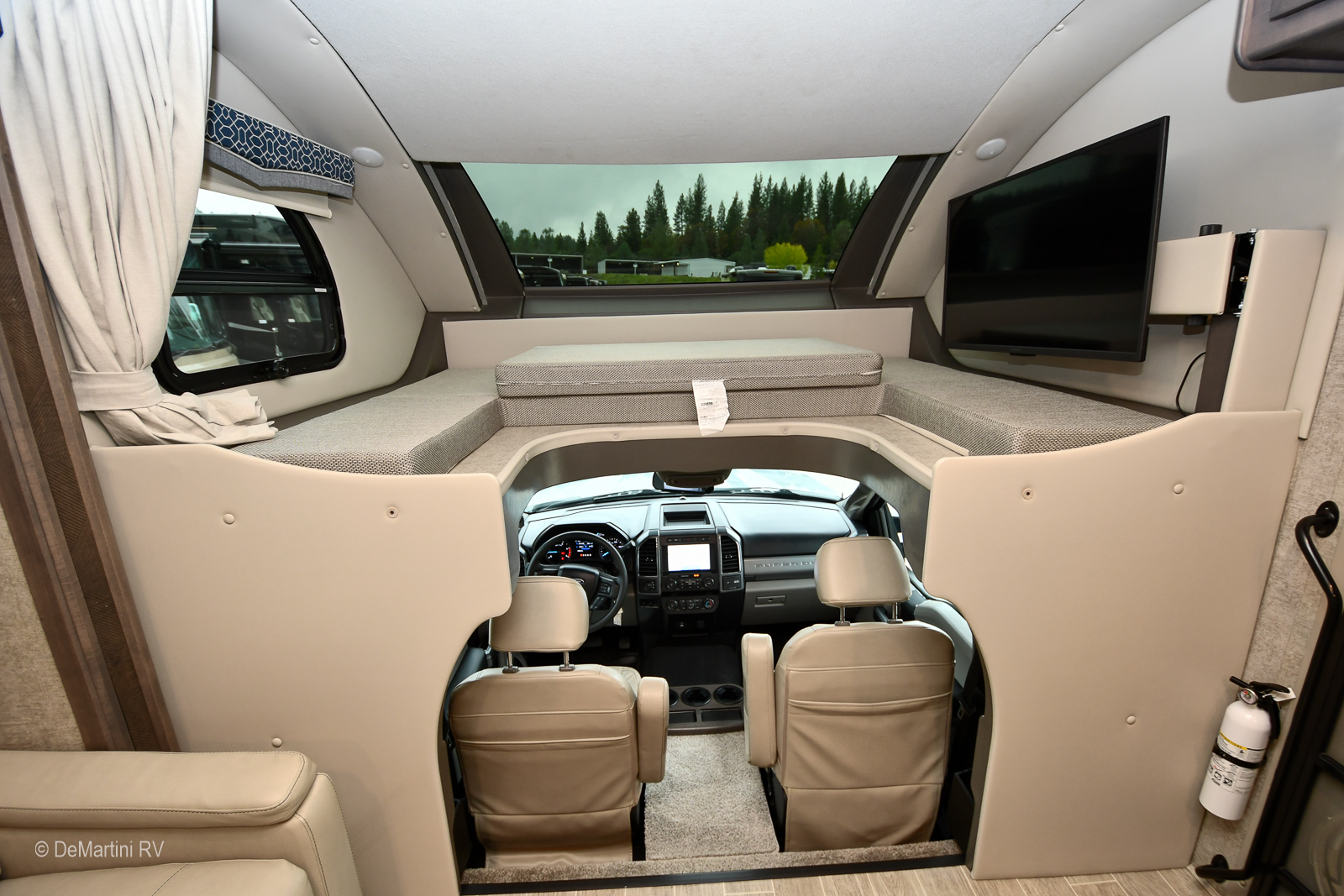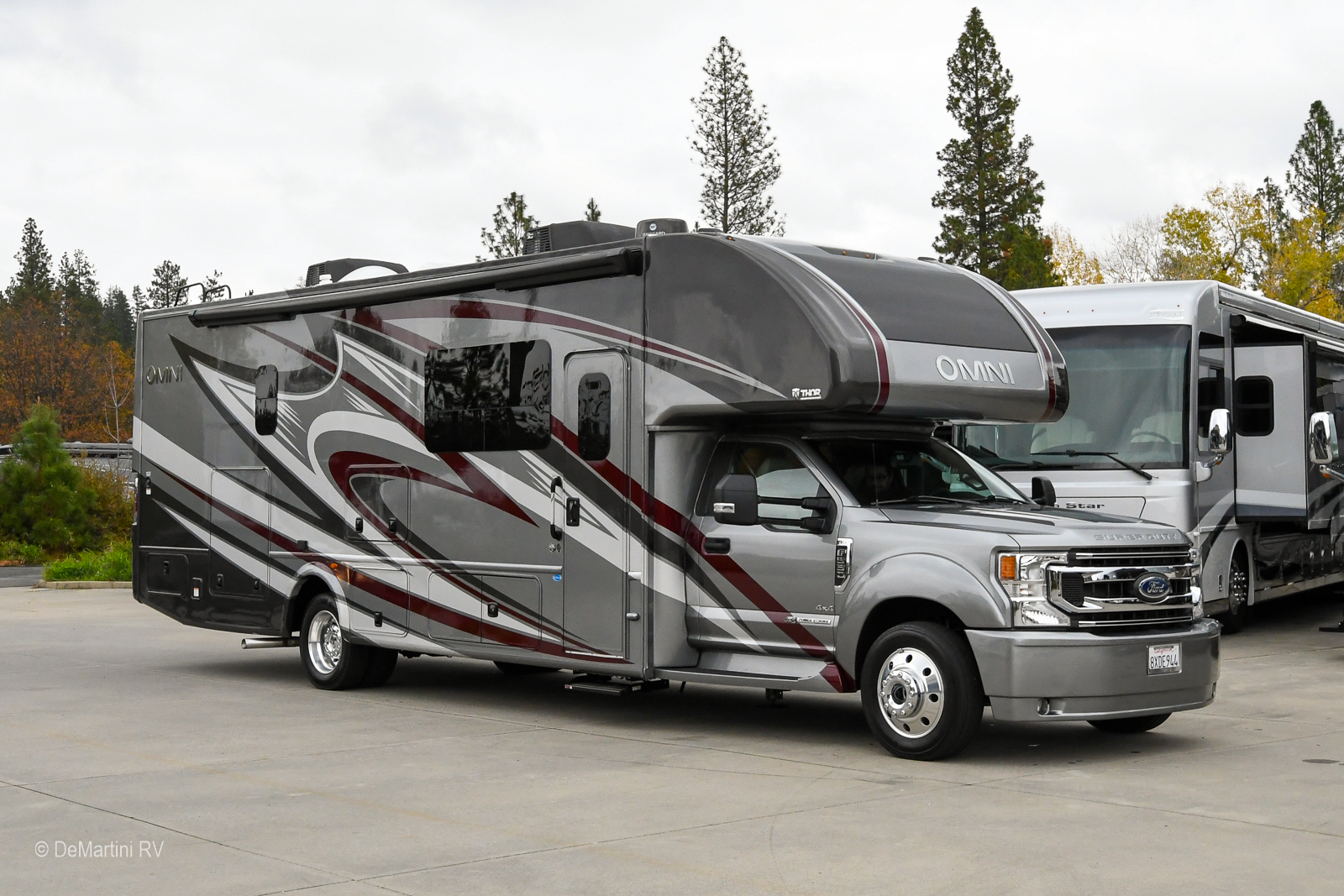 2022 Thor Omni SV34 Full Wall Slide-Out Class C. This Coach is Built on a Ford Chassis and Powered by a Ford Power Stroke 6.7L V8 Engine with only 13,852 Miles! Equipment Includes: Aluminum Wheels, Side-Hinged Baggage Doors, Pass Through Storage, Hydraulic Leveling Jacks, 2000 Watt Inverter, 3M Film Front Mask, Two Solar Panels, Exterior Entertainment Center w/TV, Auto Patio Awning, Dual Ducted Roof A/C's, Exterior Kitchen, On-Demand Water Heater, Exhaust Brake, Adjustable Pedals, 3-Camera Rear Vision System, Power Pilot Seat, Leather Cockpit Seats, GPS Navigation System, Brake Controller, and Water Purifier, LCD TV in Bedroom, LCD TV in Living Area, Residential Refrigerator, Convection Microwave, Solid Surface Countertop, Multiplex Wiring System, Induction/Gas Cooktop. Equipped with a Onan 6.0KW Diesel Generator with only 114 Hours. The Floorplan Features: Full Wall Slide-Out, Booth Dinette, Leather Theater Seats, Private Bath, King Bed, Cab Over Sleeper. Asking only $169,900! Item #D3222 DeMartini RV Sales