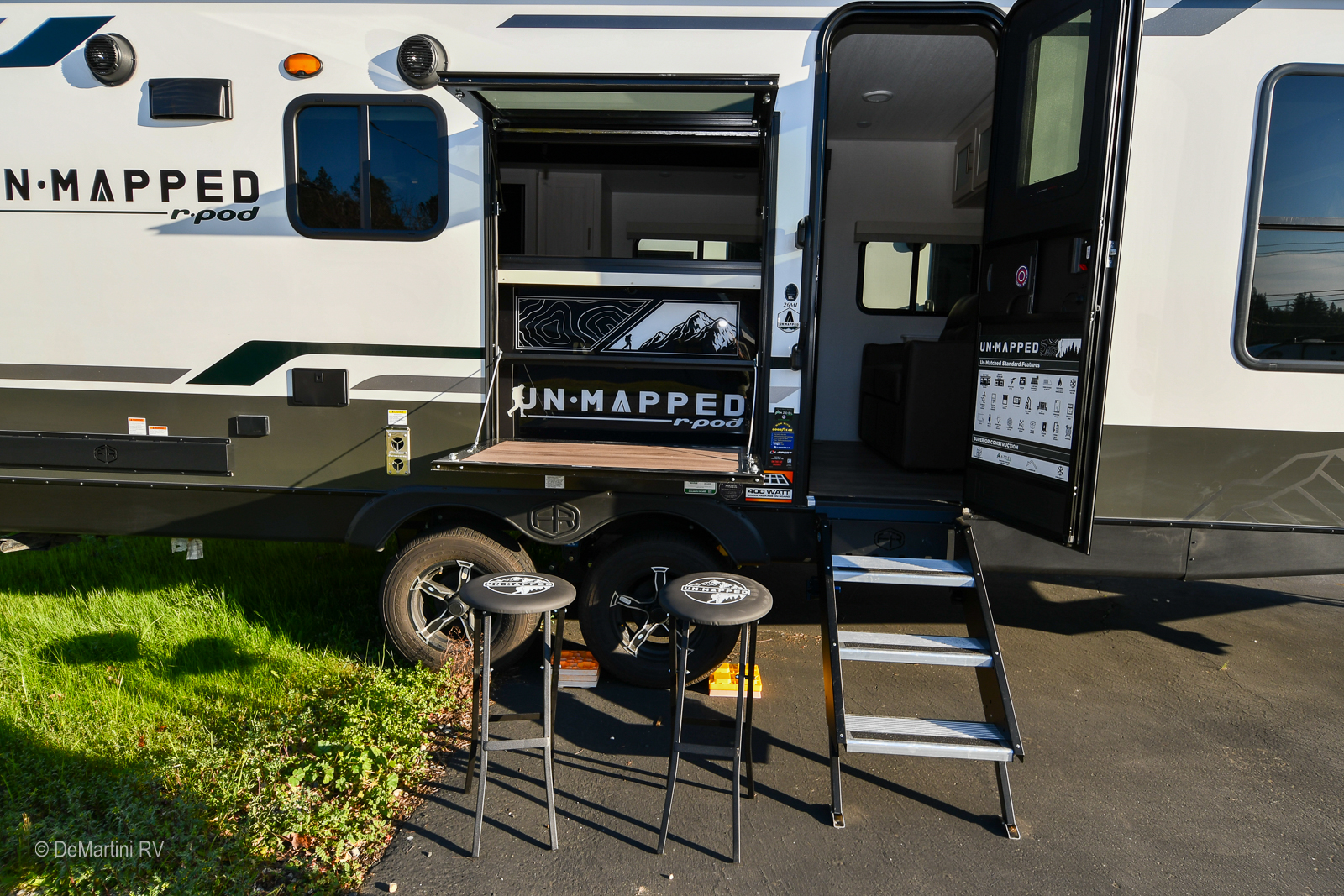 2026 Forest River R-Pod Unmapped 26ML Slide-Out Travel Trailer. Un•Mapped, a refreshing lineup of half-ton towable travel trailers packed with first-to-market features and uncompromising comfort, all under 30’. With versatile floorplans and impressive features like the outdoor Trailgate bar and Bar2Table dinette, your ultimate adventure will begin with Un•Mapped. The Un•Mapped 26ML features a 12V black glass refrigerator and an air fryer microwave. The Bar2Table pull-out dinette and TrailGate outdoor bar enhance dining flexibility and outdoor entertaining. Inside, enjoy a private custom king bed, 15K A/C, and a tankless on-demand water heater. Exterior amenities include a 21' powered awning, outdoor camp kitchen, and a hot & cold spray port.The MSRP is over $56K but we're slashing it down too low to advertise! Item #D3242 DeMartini RV Sales