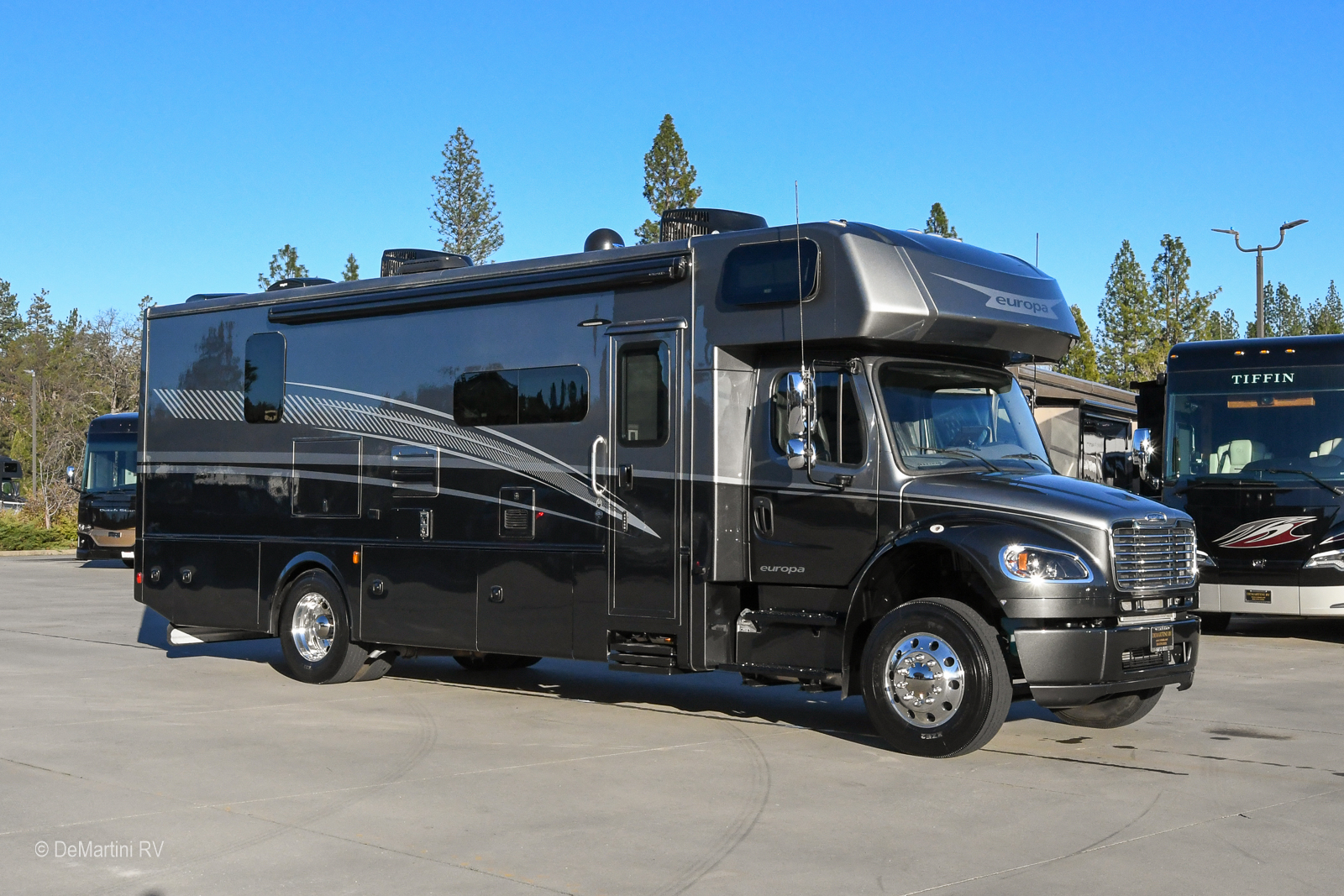 2022 Dynamax Europa 31SS Double Slide-Out Class Super C. This Coach is Built on a Freightliner Chassis and Powered by a Cummins 6.7L I6 360HP Turbo Diesel Engine with 37,215 Miles! Equipment Includes: Power Cord Reel, Aluminum Wheels, Side-Hinged Baggage Doors, Hydraulic Leveling Jacks, 3M Film Front Mask, Two Solar Panels, MaxxAir Vents, Gateway Winegard WiFi, Exterior Entertainment Center w/TV, Auto Patio Awning, Dual Ducted Roof A/C's w/Heat Pumps, 3000 Watt Inverter, Sani-Con System, On-Demand Water Heater, CB Radio, 3-Camera Rear Vision System, Leather Cockpit Seats, GPS Navigation System, Trip Computer, Brake Controller, Engine Brake, and Water Purifier, DVD Player, LCD TV in Bedroom, LCD TV in Living Area, 4-Door Refrigerator, Convection Microwave, Solid Surface Countertop, Multiplex Wiring System. Equipped with a Onan 8.0KW Diesel Generator with 219 Hours. The Floorplan Features: Double Slide-Out, Booth Dinette, Leather Theater Seats, Private Toilet, King Bed, Cab Over Sleeper. Asking Only $194,900! Item #D3250 DeMartini RV Sales