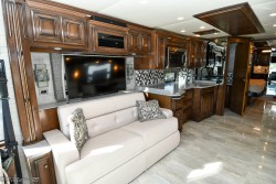Equipment Includes: Oasis Hydronic Heating System, Power Water Hose Reel, Power Cord Reel, Aluminum Wheels, Side-Hinged Baggage Doors, Slide-Out Storage Tray, Pass Through Slide-Out Storage Tray, Hydraulic Leveling Jacks, 3M Film Front Mask, Exterior Entertainment Center with TV, Full Encased Awnings, Power Window Awning(s), Auto Front Door Awning, Auto Patio Awning, Dual Ducted Roof A/Cs with Heat Pumps, Auto Steer Tag Axle, Comfort Drive System, Adjustable Pedals, 3-Camera Rear Vision System, Power Driver Window, Power Leather Cockpit Seats, Co-Pilot Power Footrest, Heated Cockpit Seats, GPS Navigation System, Trip Computer, Power Sun Visors, CD Player, Three Stage Engine Brake, Central Vacuum System, Water Purifier, Stacked Washer/Dryer, Blu-Ray Players, LCD TV in Bedroom, LCD TV in Cockpit, Residential Refrigerator, Convection Microwave, Solid Surface Countertops and Televator in Living Area. Equipped with an Onan 8.0KW Diesel Generator with 212 Hours.