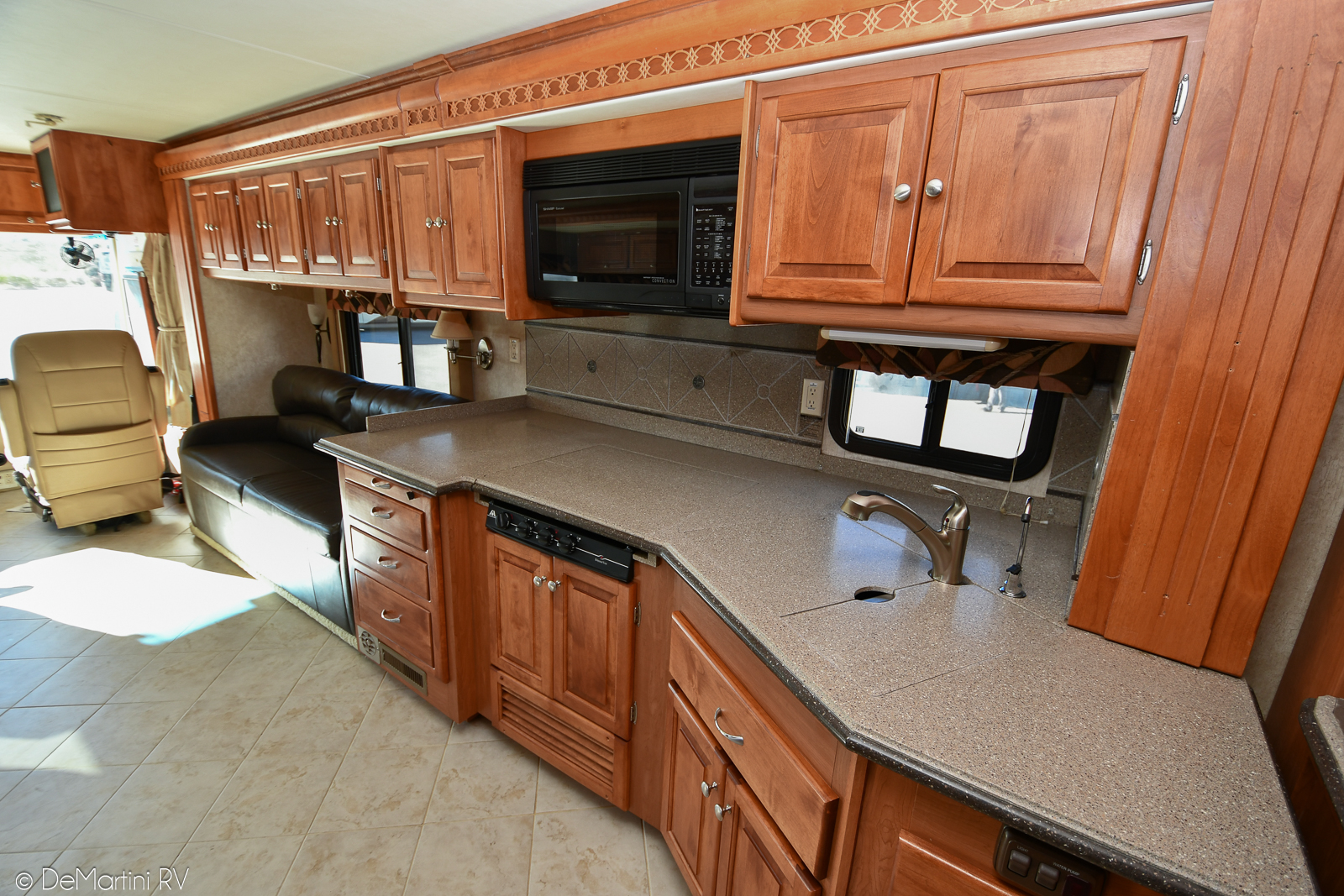 Equipment Includes: Brand New Tires, Aluminum Wheels • Side-Hinged Baggage Doors • Pass Through Slide-Out Storage Trays • Leveling Jacks • 2000 Watt Inverter • Full Encased Awnings • Auto Front Door Awning • Auto Patio Awning • Dual Ducted Roof A/Cs • Exhaust Brake • Adjustable Pedals • 3-Camera Rear Vision System • Power Leather Cockpit Seats • Co-Pilot Power Footrest • Trip Computer • Power Sun Visors • CD Player • Brake Controller • Central Vacuum System • Water Purifier • LCD TV in Bedroom • LCD TV in Living Area • 4-Door Refrigerator with Icemaker • Convection Microwave • Solid Surface Countertops. Equipped with an Onan 7.5KW Diesel Generator.