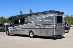 Equipment Includes: Power Water Hose Reel • Power Cord Reel • MaxxAir Vents • Aqua Hot Water System • Aluminum Wheels • Side-Hinged Baggage Doors • Pass Through Storage • Keyless Entry • Hydraulic Leveling Jacks • 2.8KW Pure Sine Wave Inverter • 3M Film Front Mask • Two Solar Panels • Exterior Entertainment Center with TV • Full Encased Awnings • Two Power Patio Awnings • Dual Ducted Roof A/Cs with Heat Pumps • Auto Generator Start • Sani-Con System • CB Radio • 3-Camera Rear Vision System • Leather Air-Ride Cockpit Seats • Mobileye System • GPS Navigation System • Trip Computer • Brake Controller • Engine Brake • Water Purifier • Stacked Washer/Dryer • LCD TV in Bedroom • Residential Refrigerator • Fireplace • Convection Microwave • Solid Surface Countertops • Multiplex Wiring System • Power TV Lift in Living Area • Induction Cooktop.