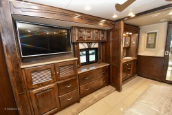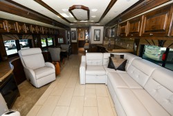 Equipment Includes: Power Water Hose Reel • Power Cord Reel • Aqua Hot Water System • Aluminum Wheels • Side-Hinged Baggage Doors • Pass Through Slide-Out Storage Tray • Pass Through Storage • Keyless Entry • Hydraulic Leveling Jacks • 2000 Watt Inverter • 3M Film Front Mask • Exterior Entertainment Center with TV • Full Encased Awnings • Window Awning(s) • Auto Front Door Awning • Auto Patio Awning • Three Ducted Roof A/Cs with Heat Pumps • Tag Axle • Adjustable Pedals • CB Radio • 3-Camera Rear Vision System • Power Leather Cockpit Seats • Co-Pilot Power Footrest • GPS Navigation System • Trip Computer • Tire Pressure Monitoring System • Power Sun Visors • Engine Brake • Central Vacuum System • Water Purifier • Stacked Washer/Dryer • Safe • Blu-Ray Player • LCD TV in Bedroom • LCD TV in Living Area • LCD TV in Cockpit • Residential Refrigerator • Fireplace • Dishwasher • Convection Microwave • Ceiling Fan in Bedroom • Solid Surface Countertops • Multiplex Wiring System • Induction Cooktop.