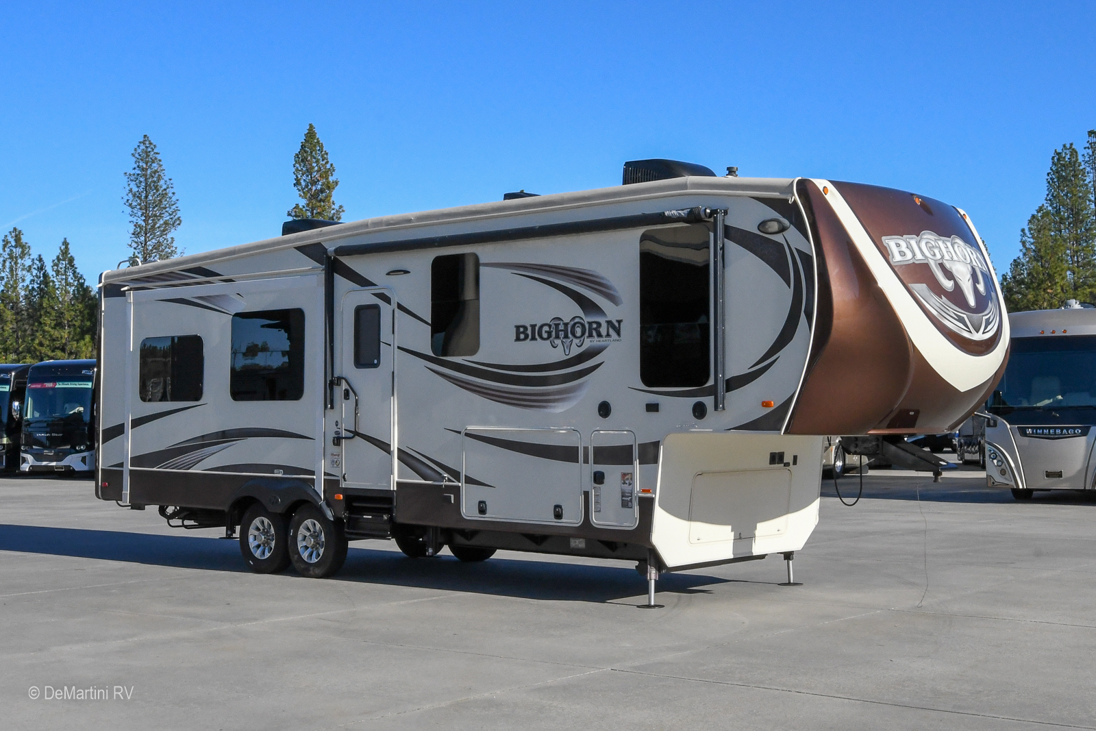2015 Heartland Big Horn 3010RE Triple Slide-Out Fifth Wheel Trailer. Equipment Includes: Power Cord Reel, Spare Tire, Pass Through Slide-Out Storage Tray, Leveling Jacks, 2000 Watt Inverter, Auto Patio Awning, Dual Ducted Roof A/Cs, and LCD TV in Bedroom, 4-Door Refrigerator, Fireplace, Oven, Convection Microwave, Ceiling Fan, Power TV Lift in Living Room. The Floorplan Features: Triple Slide-Out, Leather Sleeper Sofa, Two Euro Recliners, Dinette Table and Chairs, Private Bath, King Bed, Rear Wardrobe. Asking only $32,900! Item #D2978 DeMartini RV Sales
