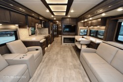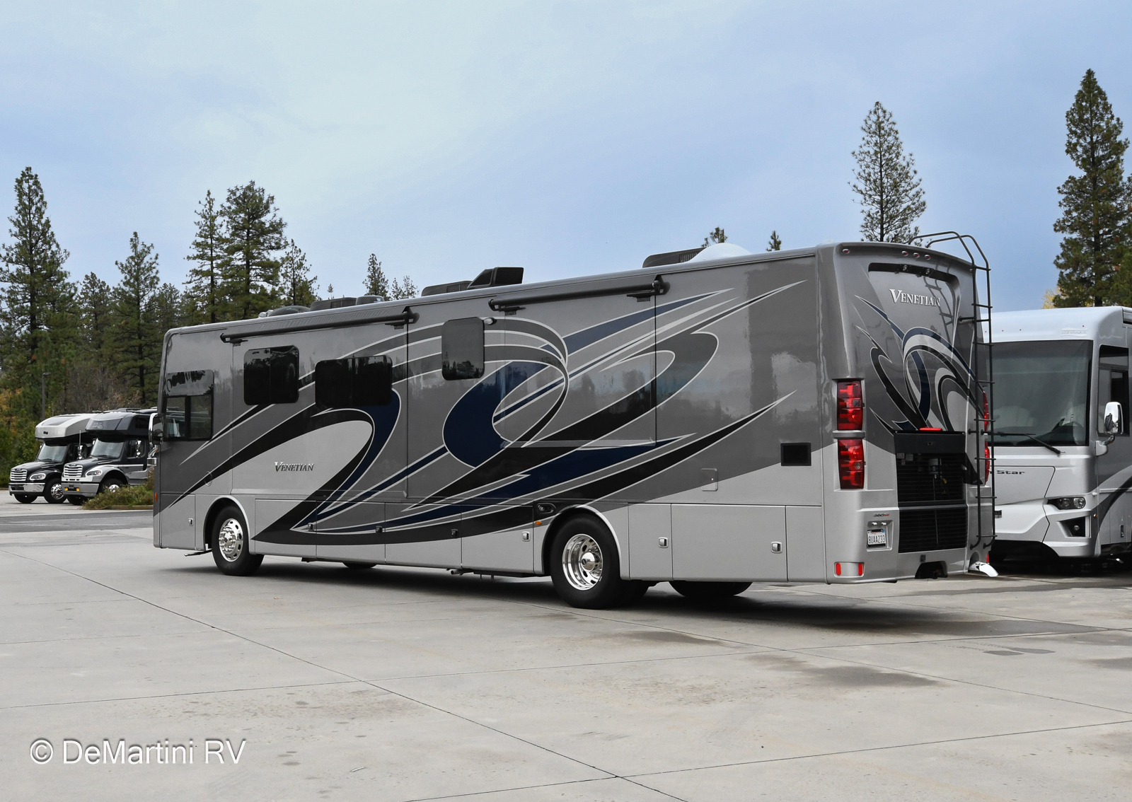 2021 Thor Venetian R40 Full Wall/3 Class A - Diesel Pusher. This Coach is Built on a Freightliner Chassis and Powered by a Cummins L9 380HP Turbo Diesel Engine with only 17,308 Miles! Equipment Includes: Power Water Hose Reel, Power Cord Reel, Aqua Hot Water System, Aluminum Wheels, Side-Hinged Baggage Doors, Pass Through Slide-Out Storage Tray, Pass Through Storage, Hydraulic Leveling Jacks, 2000 Watt Inverter, 3M Film Front Mask, Solar Panel, Exterior Entertainment Center w/TV, Full Encased Awnings, Auto Front Door Awning, Auto Patio Awning, Three Ducted Roof A/C's w/Heat Pumps, 3-Camera Rear Vision System, Power Leather Cockpit Seats, Co-Pilot Power Footrest, GPS Navigation System, Trip Computer, Power Sunvisors, Engine Brake, Dropdown Overhead Bunk, and Central Vacuum System, Water Purifier, Stacked Washer/Dryer, Blu-Ray Players, LCD TV in Bedroom, LCD TV in Living Area, Residential Refrigerator, Fireplace, Convection Microwave, Ceiling Fan in Bedroom, Solid Surface Countertops, Multiplex Wiring System, Power TV Lift in Living Area, Induction Cooktop. Equipped with a Onan 10.0KW Diesel Generator with only 70 Hours. The Floorplan Features: Full Wall/3, Leather Sleeper Sofa, Leather Theater Seats, Full Tile Floor, Dinette Table and Chairs, Bath and a Half Floorplan, King Bed. Asking only $224,900! Item #D3226 DeMartini RV Sales