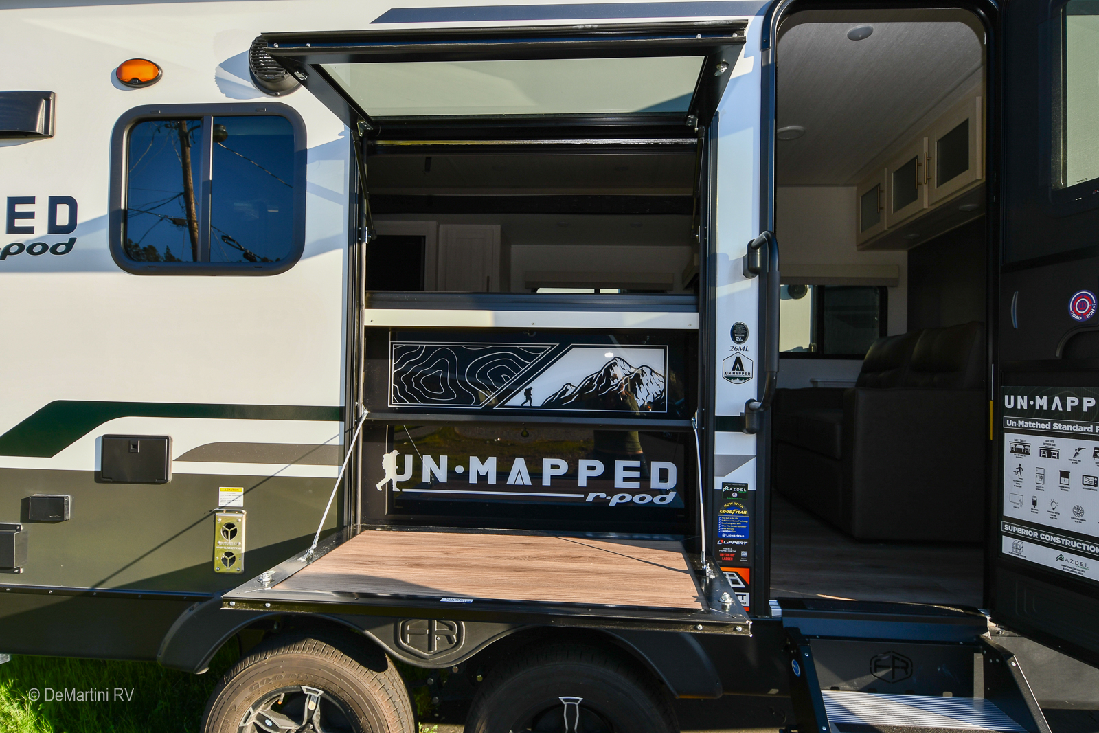 2026 Forest River R-Pod Unmapped 26ML Slide-Out Travel Trailer. Un•Mapped, a refreshing lineup of half-ton towable travel trailers packed with first-to-market features and uncompromising comfort, all under 30’. With versatile floorplans and impressive features like the outdoor Trailgate bar and Bar2Table dinette, your ultimate adventure will begin with Un•Mapped. The Un•Mapped 26ML features a 12V black glass refrigerator and an air fryer microwave. The Bar2Table pull-out dinette and TrailGate outdoor bar enhance dining flexibility and outdoor entertaining. Inside, enjoy a private custom king bed, 15K A/C, and a tankless on-demand water heater. Exterior amenities include a 21' powered awning, outdoor camp kitchen, and a hot & cold spray port.The MSRP is over $56K but we're slashing it down too low to advertise! Item #D3242 DeMartini RV Sales