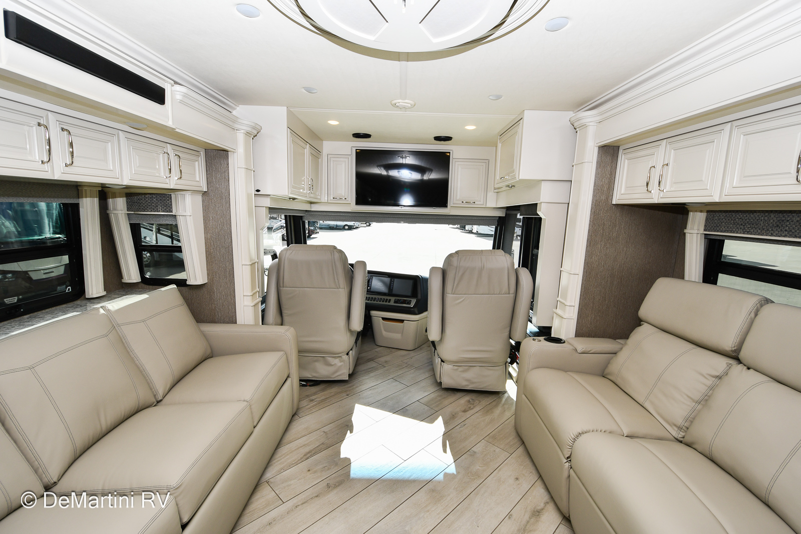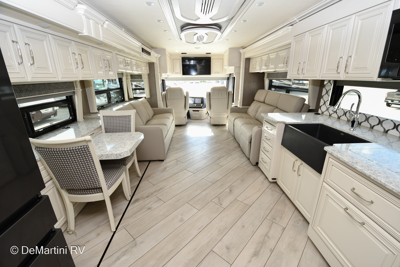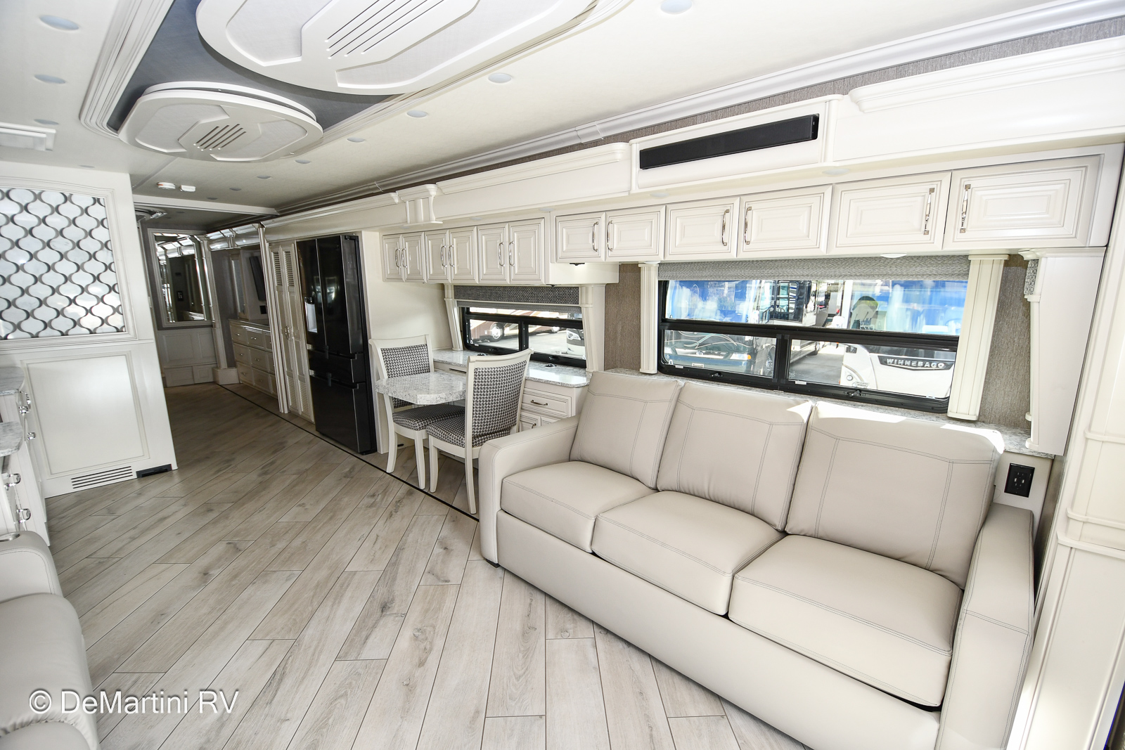 2021 American Coach American Dream 45A Full Wall/3 Class A - Diesel Pusher. This Coach is Built on a Freightliner Chassis and Powered by a Cummins X15 605HP Diesel Engine with only 25,003 Miles! Equipment Includes: Power Water Hose Reel, Power Cord Reel, Aqua Hot Water System, Aluminum Wheels, Side-Hinged Baggage Doors, Slide-Out Storage Trays, Pass Through Slide-Out Storage Tray, Keyless Entry, Air/Hydraulic Leveling, 2.8KW Pure Sine Wave Inverter, 3M Film Front Mask, Solar Panel, Wi-Fi Extender, MaxxAir Vents, Exterior Entertainment Center w/TV, Full Encased Awnings, Window Awning(s), Auto Front Door Awning, Two Power Patio Awnings, Three Ducted Roof A/C's w/Heat Pumps, Tag Axle, Sani-Con System, Exterior Freezer, Adjustable Pedals, 3-Camera Rear Vision System, Mobileye System, Power Leather Cockpit Seats, Co-Pilot Power Footrest, GPS Navigation System, Trip Computer, Tire Pressure Monitoring System, Power Sunvisors, Brake Controller, Engine Brake, and Central Vacuum System, Water Purifier, Stacked Washer/Dryer, Power Blinds Through Out, Blu-Ray Player, LCD TV in Bedroom, LCD TV in Cockpit, Residential Refrigerator, Dishwasher, Convection Microwave, Solid Surface Countertops, Multiplex Wiring System, Power TV Lift in Living Area, Induction Cooktop. Equipped with a Onan 12.5KW Diesel Generator with only 146 Hours. The Floorplan Features: Full Wall/3, Leather Hide-a-bed Sofa, Leather Theater Seats, Heated Floors, Full Tile Floor, Dinette Table and Chairs, Bath and a Half Floorplan, King Bed, Rear Wardrobe. Asking only $359,900! Item #D3249 DeMartini RV Sales